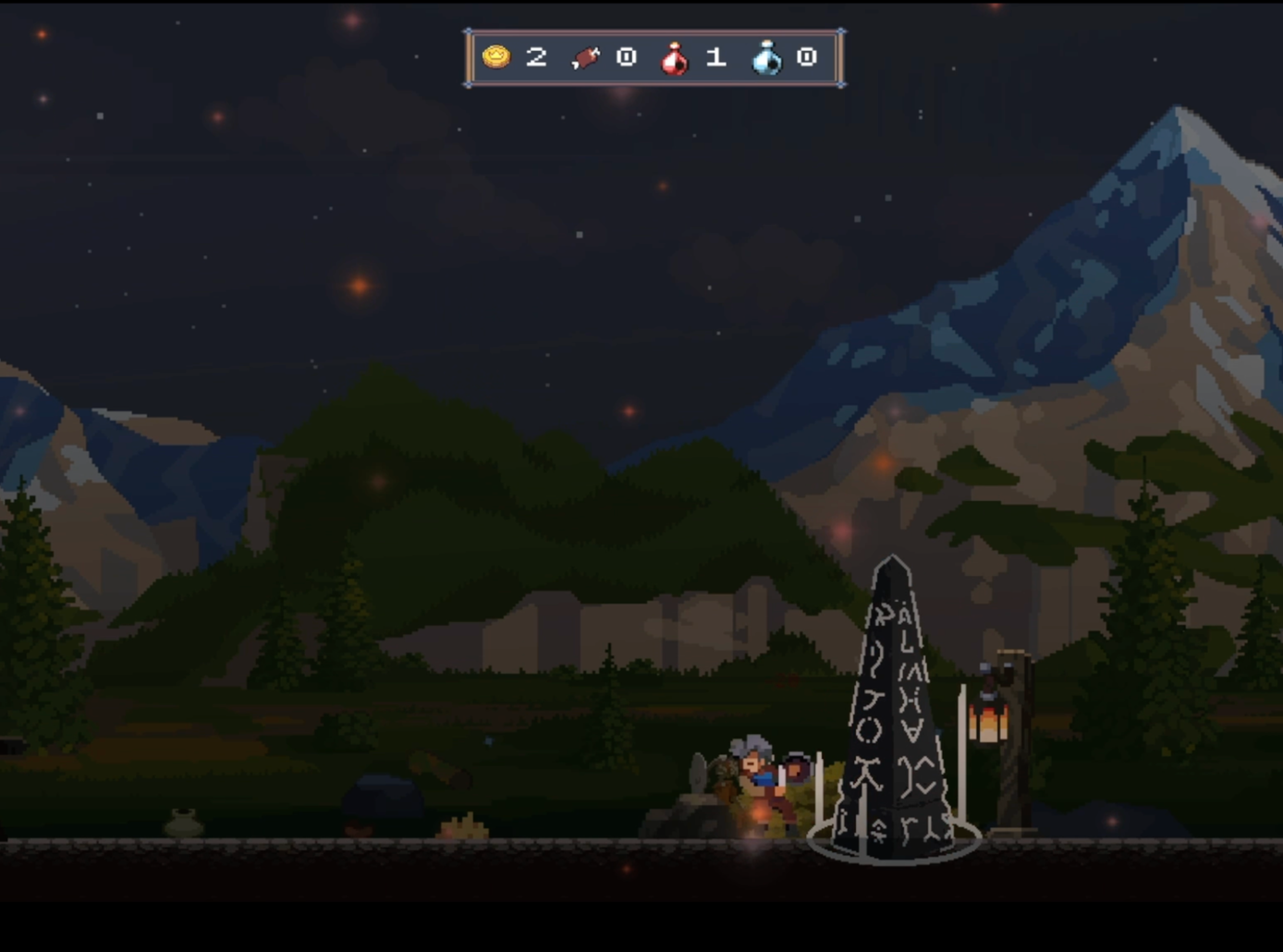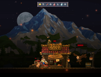 Gameplay unfolds on a flat, side-view plane with a focus on combat, timing, and preparation rather than platforming. As the day–night cycle progresses, obelisks awaken and spawn enemies after nightfall. Defeated creatures drop coins, which can be spent at the shop on essential supplies such as food and attack or shield potions to survive increasingly dangerous nights.